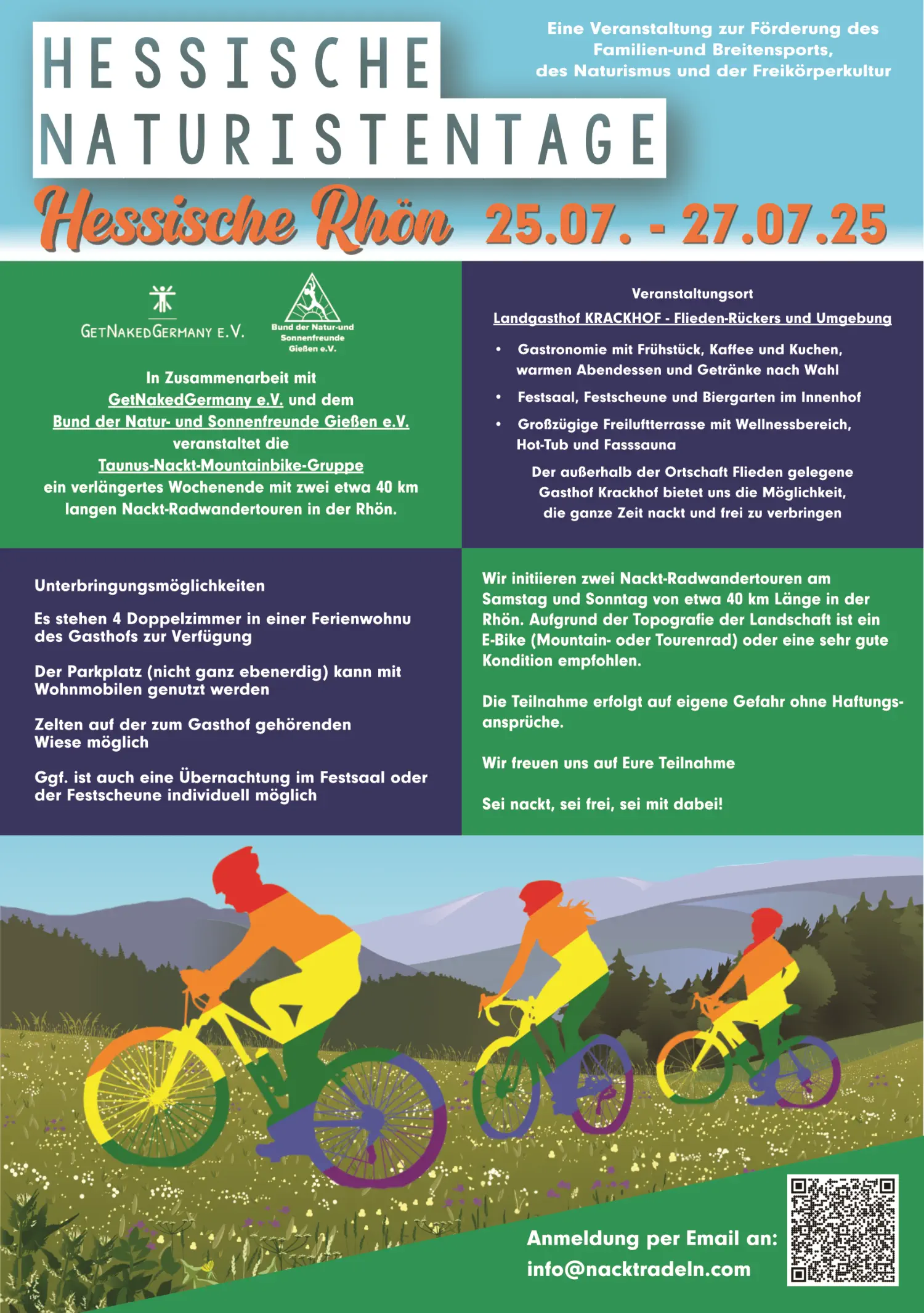 Wir, die Taunus-Nackt-Mountainbiker-Gruppe, initiieren, in Zusammenarbeit mit GetNakedGermany e.V. und dem Bund der Natur- und Sonnenfreunde Gießen e.V., zwei Nackt-Radwandertouren am Samstag und Sonntag von etwa 40 km Länge in der Rhön.Aufgrund der Topograpfie der Landschaft st ein E-Bike (Mountain- oder Tourenrad) oder eine sehr guteKondition empfohlen.Kontakt und Infos: info@nacktradeln.com