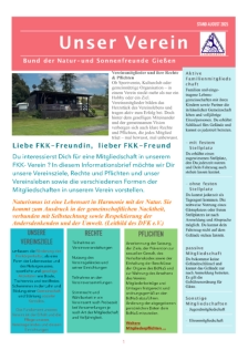•Wir sind ein eingetragener Verein für Freikörperkultur und Naturismus, für Familien- und Breitensport.• Wir sind Mitglied des DFK e.V. und INF-FNI zertifiziert.• Wir bewegen uns auf unserem Vereinsgelände nackt, wenn das Wetter es zulässt.• Wir genießen die Natur, die Sonne und je nach Laune, die Ruhe oder die Geselligkeit.Unser Vereinsgelände befindet sich inmitten der Natur, direkt an der Lahn, von dem aus vielseitige Aktivitäten in der Region unternommen werden können. Genieße bei uns das Nacktbaden in der Lahn oder ein geselliges Spiel auf unserem Bouleplatz. Paare und Familien mit Kindern sind unsere Zielgruppe. Wir sind ein familien- und kinderfreundlicher Verein. Gießen und Umgebung bieten zudem viele Events und Veranstaltungen.